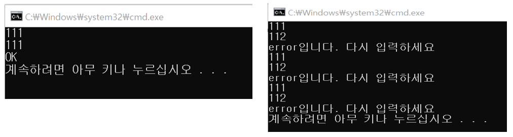 입력한 두개의 비밀번호가 다르면 오류 메세지를 화면에 보여주고 다시 비밀번호를 입력 받는다.