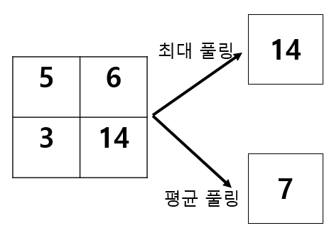 평균 풀링은 3x3 크기 내에 있는 데이터의 값의 평균을 취하는 방법으로 직관적이고 간편하지만 낮게 활성화된 성분값이 평균에 포함되면서 풀링 결과의 대비율을 떨어뜨릴 수 있다.