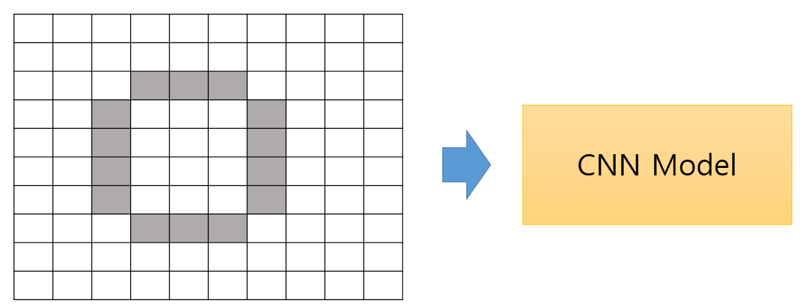 위와 같이 2차원 평면에 그림이 있다. 이제 이를 CNN모델을 이용하여 특징을 추출해보자.