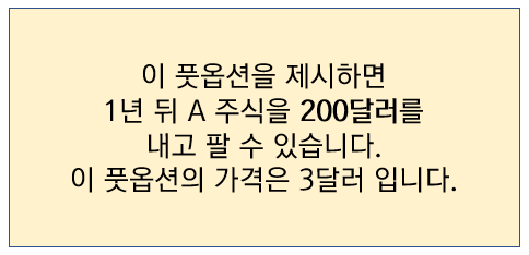 풋옵션은 콜옵션과 다르게 이 주식을 팔 수 있는 권리다. 따라서 1년 뒤 주식가격이 200달러보다 낮다면 더 낮은 가치의 주식을 높은 가격을 받고 팔 수 있으므로 이 옵션을 실행하는 것이 이득이다.