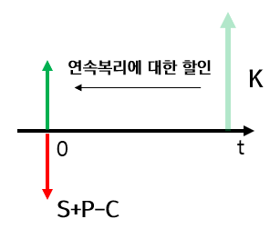 연속복리를 적용하였을 때, No Aribtrage를 만족하는 C, P, S사이의 관계는 아래 식과 같고 이를 Put-Call Option Parity Formula(P-C 짝공식)이라고 말한다.
