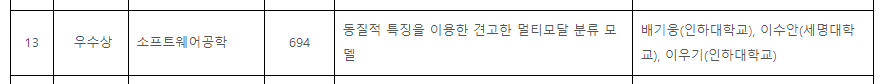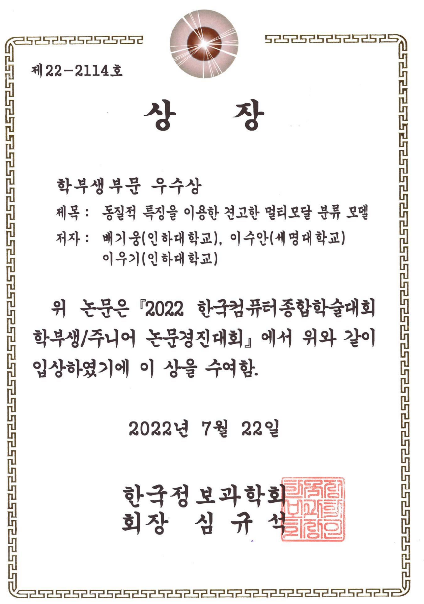 그리고 운이 좋게도 학부생/주니어논문경진대회 에서 우수상을 받았다.