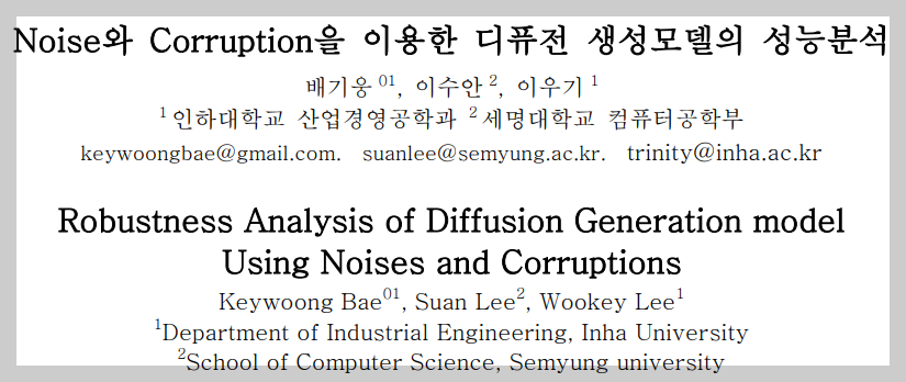 나의 네 번째 논문 작성을 완료하였다. 제목은 "Noise와 Corruption을 이용한 디퓨전 생성모델의 성능 분석"이다. 여름과 달리 이번에는 Oral 세션으로 업그레이드하여 제출하였고 Accept이 되었다. 학회에서 받은 피드백 자료를 바탕으로 보완하여 최종본을 제출하였다.