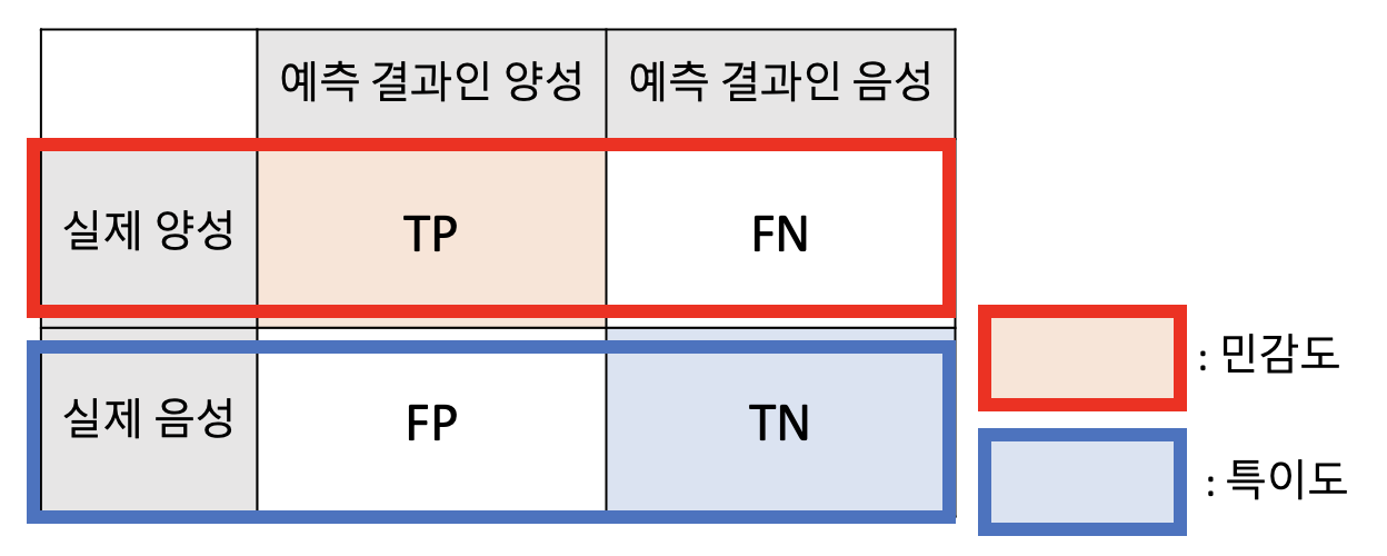 - 특이도 : 실제 음성이었을 때, 예측 결과가 음성인 경우, $\frac{TN}{TN+FP}$으로 표현된다.