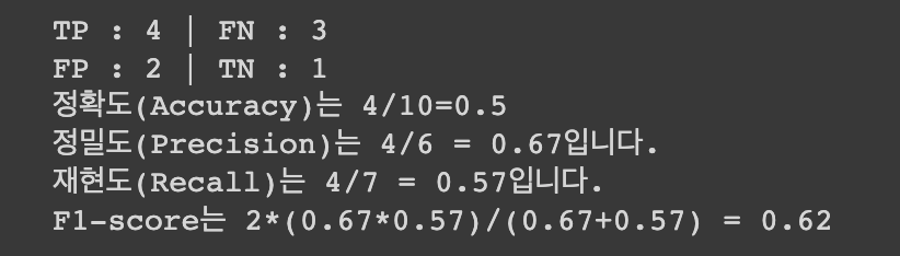 print("F1-score는 2*({}*{})/({}+{}) = {}".format(PRE,REC,PRE,REC,round(2*(PRE*REC/(PRE+REC)),2)))