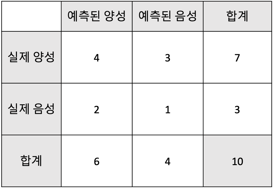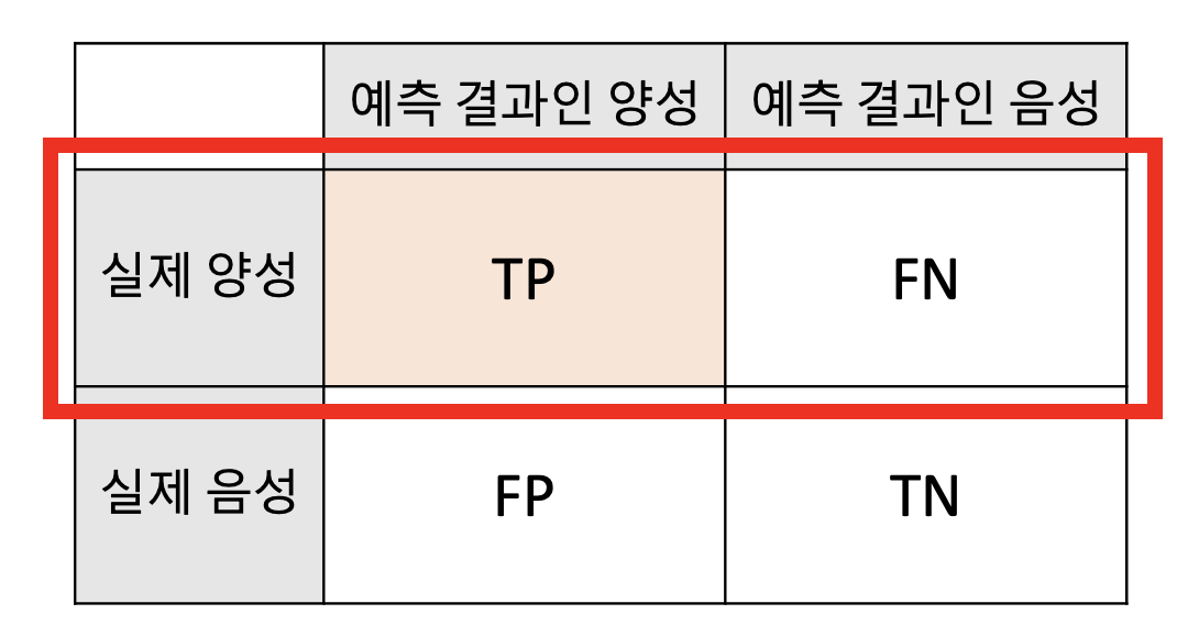 | 실제 양성 값 | TP (True Positive) | FN (False Negative) |