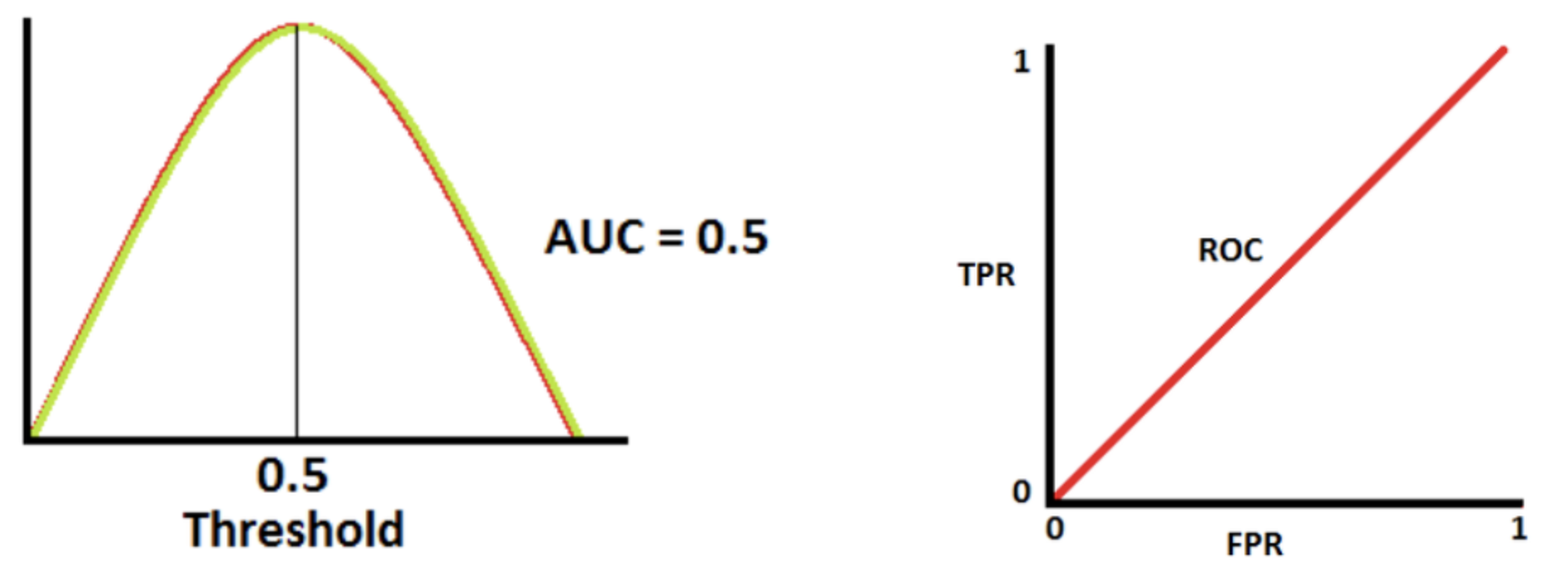 - AUC가 0.5인 경우 해당 분류모델은 양성클래스와 음성 클래스를 분류할 수 있는 능력이 없다.