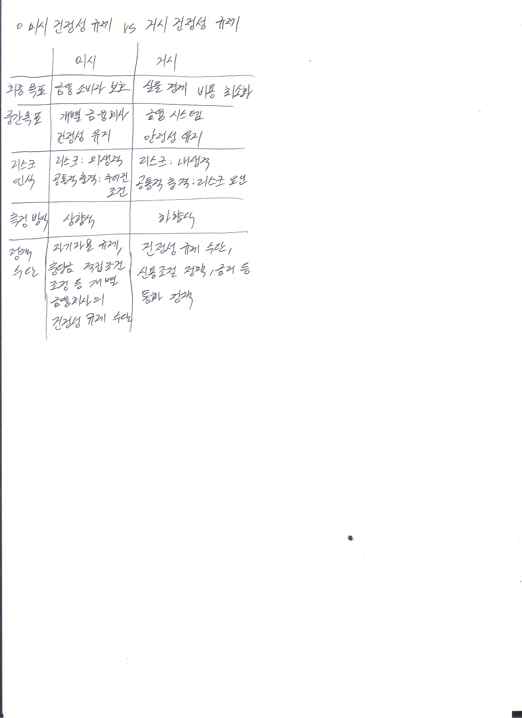 | 중간 목표 | 개별 금융회사 건정성 유지 | 금융 시스템 안정성 유지 |