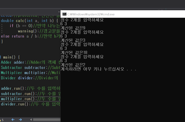 그리고 divider 클래스를 작성할 때 b가 0인 경우를 작성을 해야 하는데 calc()는 double형이라서 이를 어떻게 나타내야 할지 고민이었는데 double형 메서드에서도 string 메서드를 사용할 수 있다는 점을 배울 수 있었다.