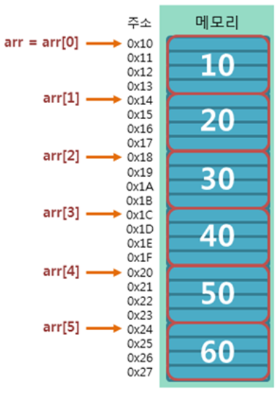 만약 위의 예시처럼 배열을 선언했다면 공간은 아래 그림처럼 할당이 된다. (int형은 4byte이므로)