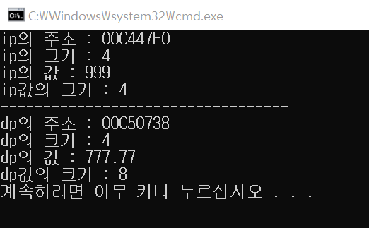 ▶ 메모리 할당을 한 결과, ip는 int형이기 때문에 4byte 크기의 메모리가 할당되었고, dp는 double형이기 때문에 8byte 크기의 메모리가 할당되었음을 알 수 있다.