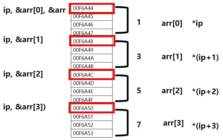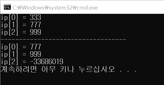 ▶ ip에 배열을 할당하고, ip++을 취한 결과, 값이 뒤쪽으로 밀려났음을 알 수 있다.