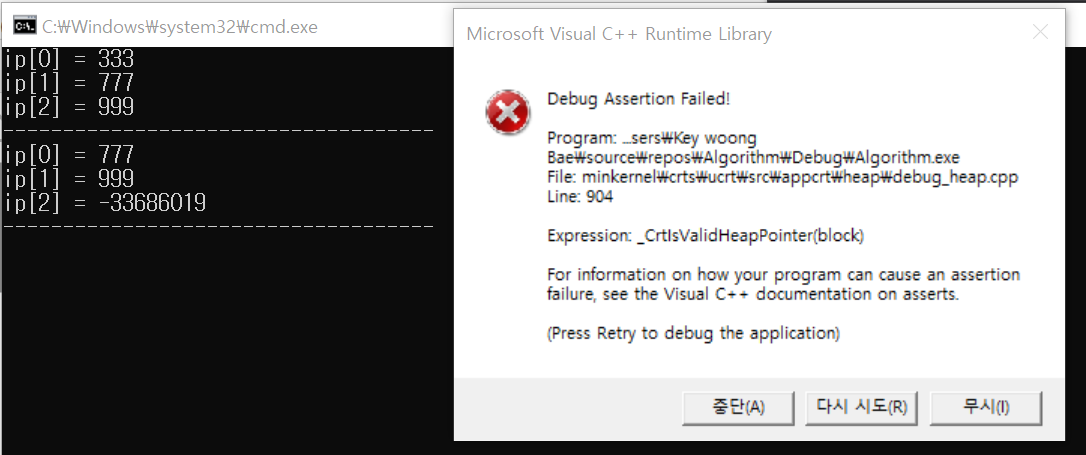 ▶ delete를 통해 해제된 ip 배열을 출력한 결과, 메모리가 없기 때문에 에러가 발생했음을 알 수 있다.
