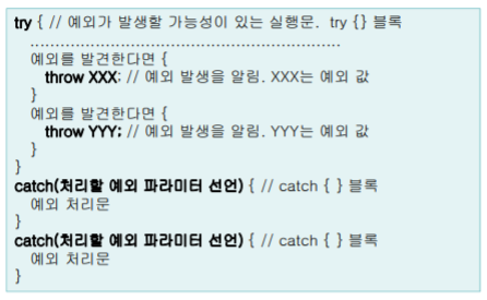 ▶ throw { }블록 => 예외가 발견되었을 때 예외 발생을 알리는 문장