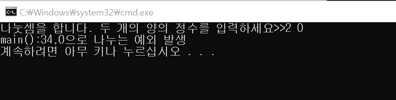 throw DivideByZeroException(34, "main()", "0으로 나누는 예외 발생");