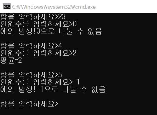 ▶ 예외가 발생할 수도 있는 코드를 나타낸 try문이다. 인원수가 0이거나 음수이면 나누는 것이 불가능하므로 이에 대한 예외를 고려하여 작성하였다.