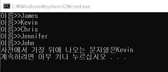 cout << "사전에서 가장 뒤에 나오는 문자열은" << latter << endl;