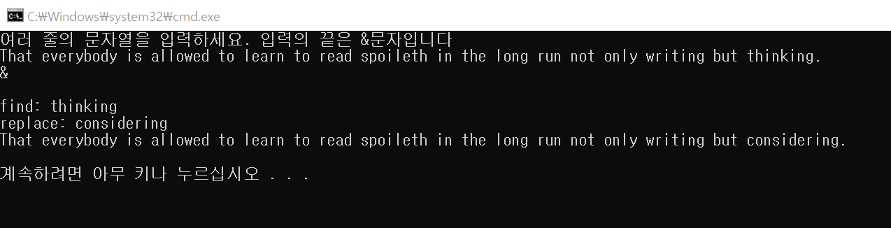 cout << "여러 줄의 문자열을 입력하세요. 입력의 끝은 &문자입니다" << endl;