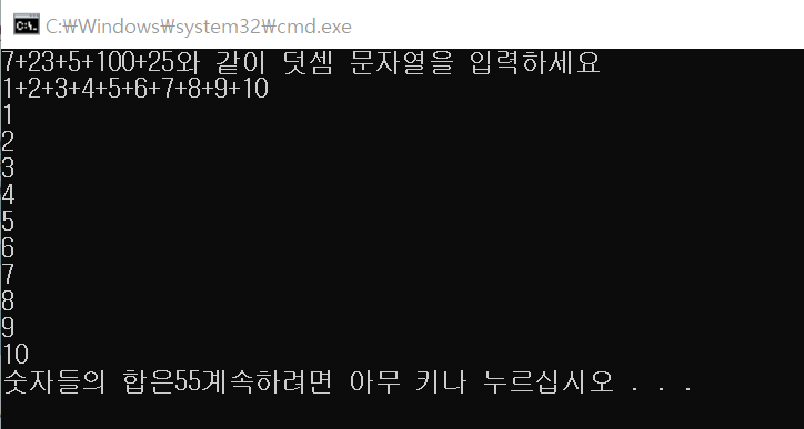cout << "7+23+5+100+25와 같이 덧셈 문자열을 입력하세요" << endl;
